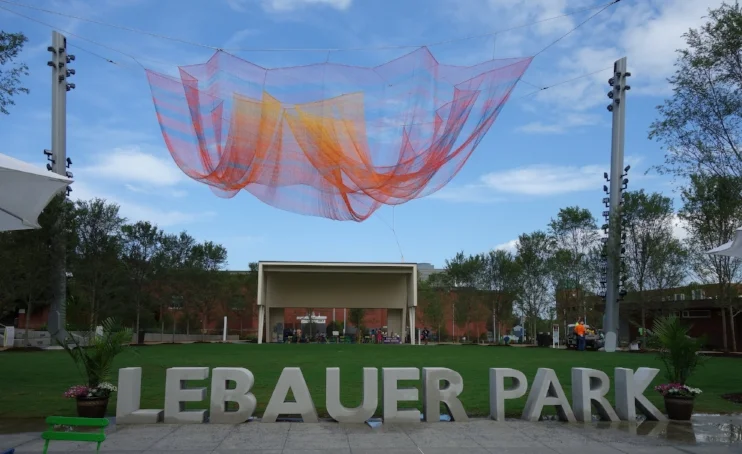 Where We Met is the first site specific installation of Janet Echelman’s work on the east coast of the United States. It is the result of a call by The Public Art Endowment, an initiative of The Community Foundation of Greater Greensboro , who wanted an iconic signature piece representative of the community and its relationship to the textile industry for the new downtown LeBauer Park.
